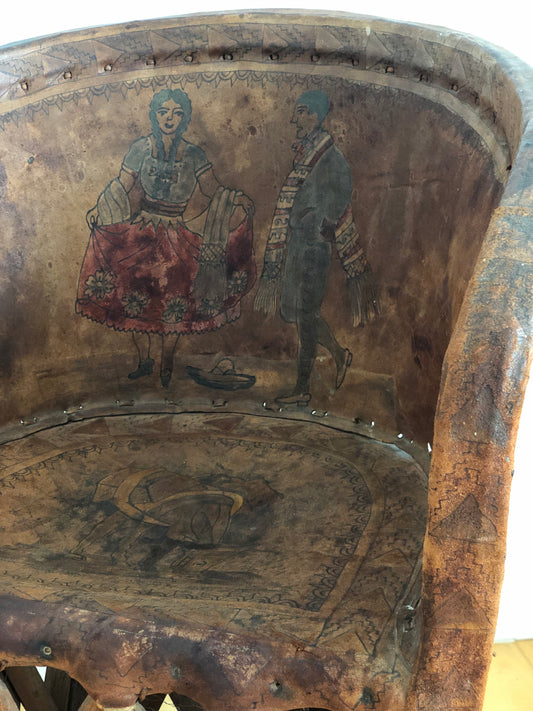 Mexican Equipale Folk Art Chair with Hand-Painted Scene 1930s