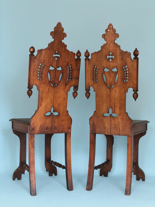Victorian Gothic Revival Carved Oak Hall Chair Set of 2