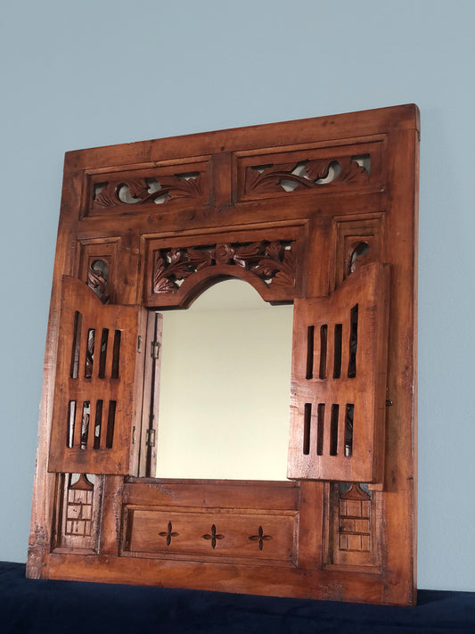 Vintage Balinese Hand Carved Shuttered Door Mirror 1950s