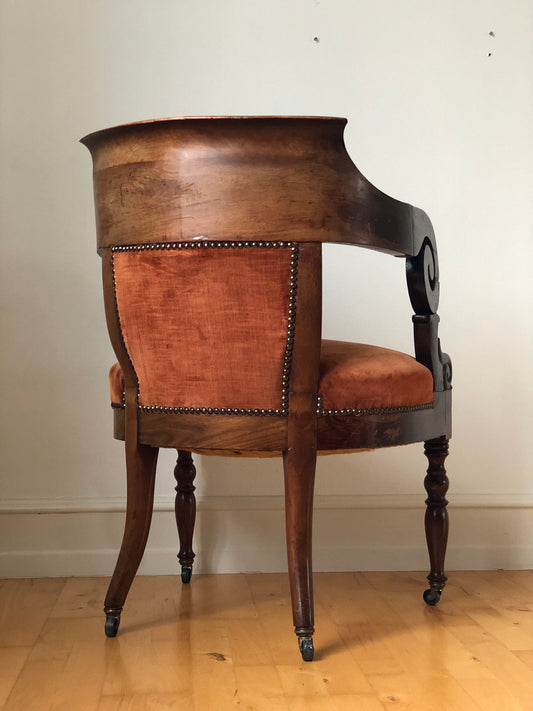 Antique Mahogany Armchair with Burgundy Fabric and Casters United Kingdom