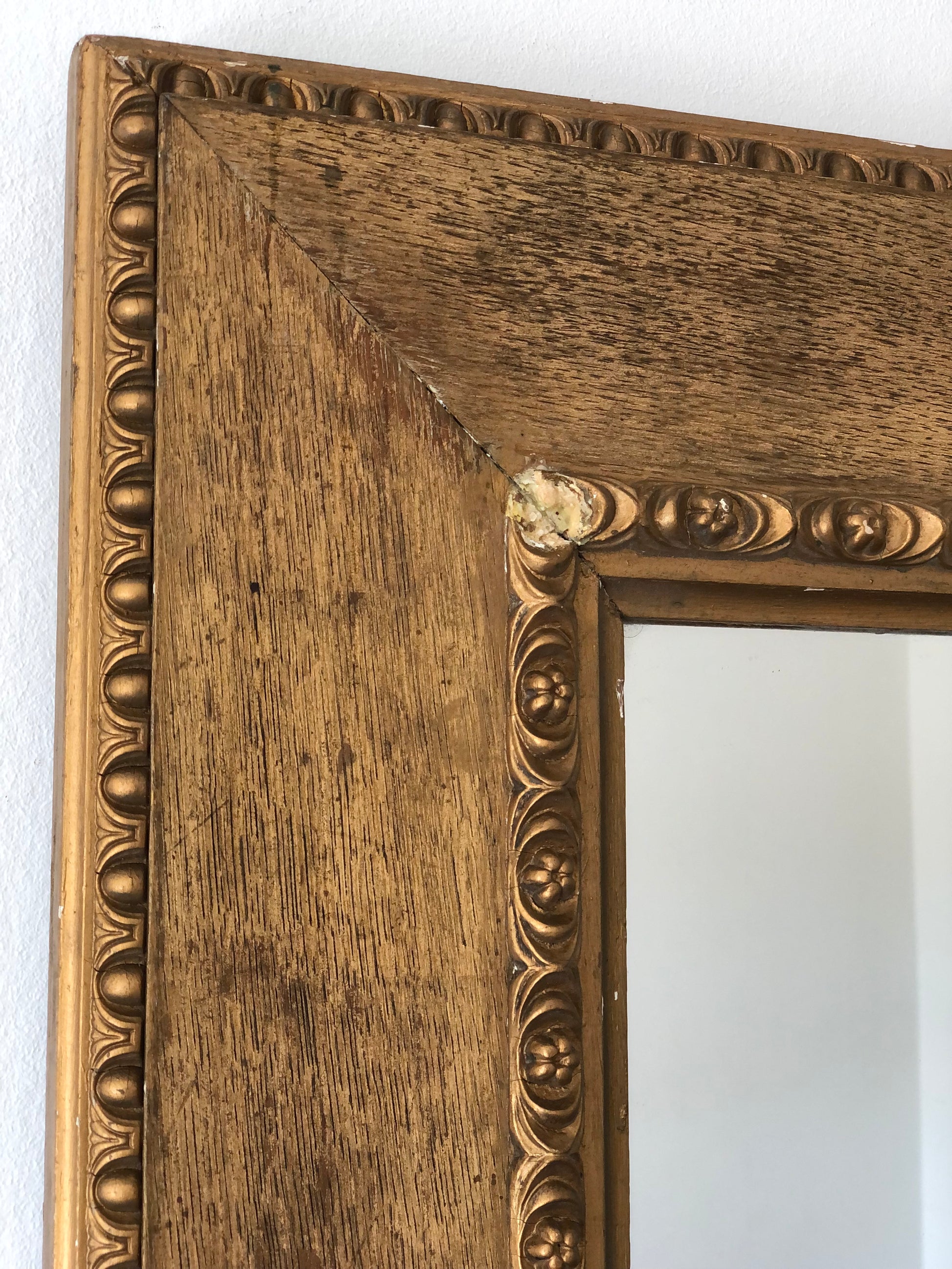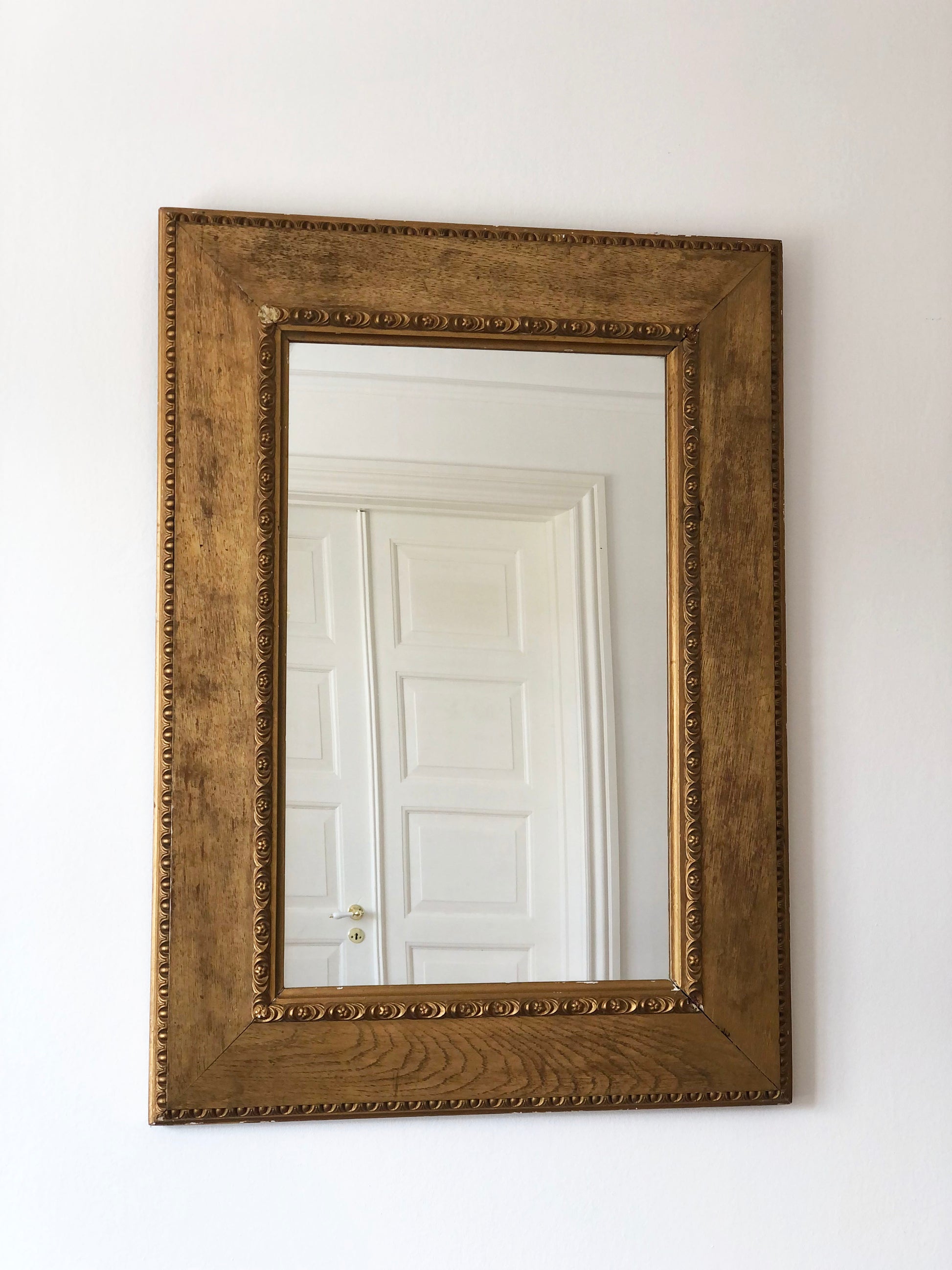 An authentic Danish giltwood mirror from the late 19th century, crafted by the renowned court gilder W. J. Mogensen in Copenhagen. The frame reflects a refined Biedermeier influence, with a broad wood-grained surface and a richly detailed gilt border featuring beaded and floral motifs.