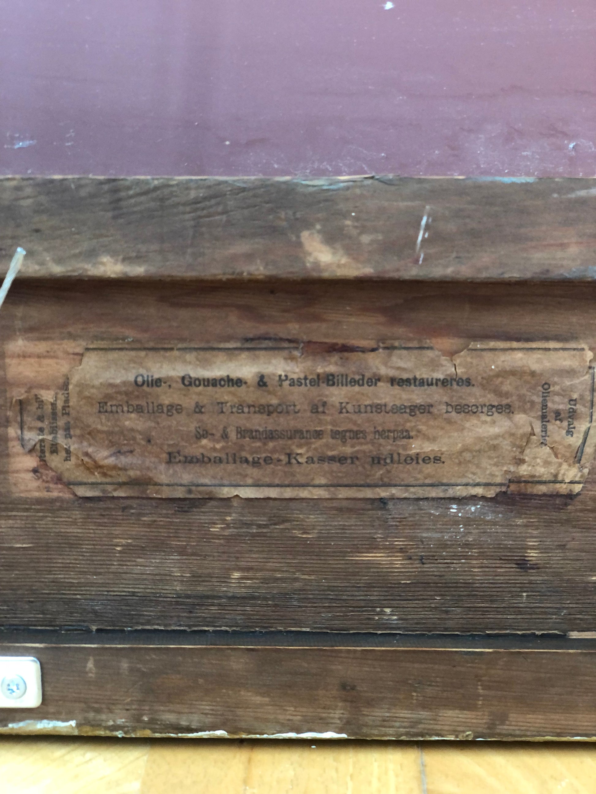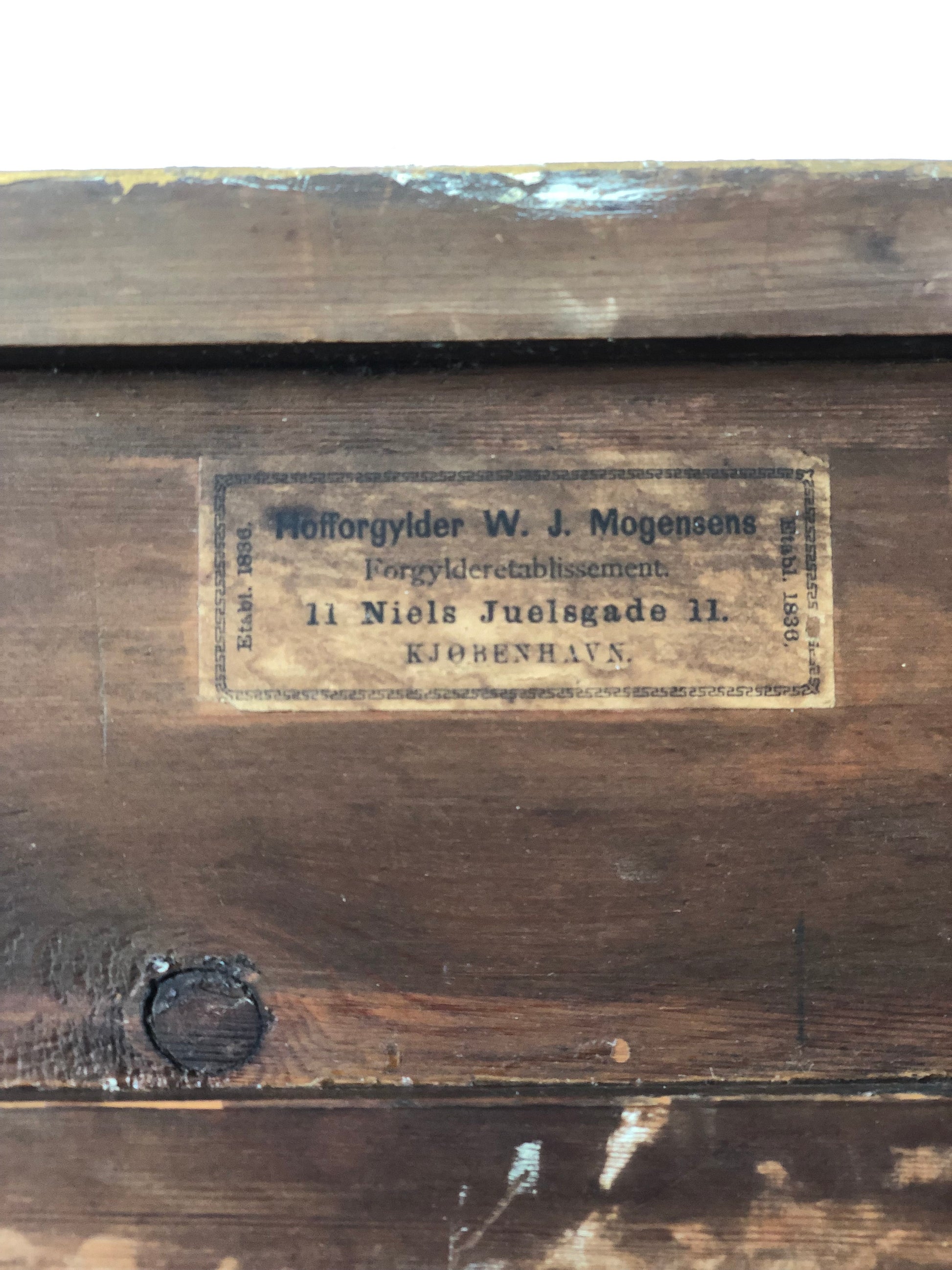 The back of the mirror retains its original maker’s labels — one reading “Hofforgylder W. J. Mogensen, Niels Juelsgade 11, Kjøbenhavn”, and another advertising restoration and transport services for fine art.