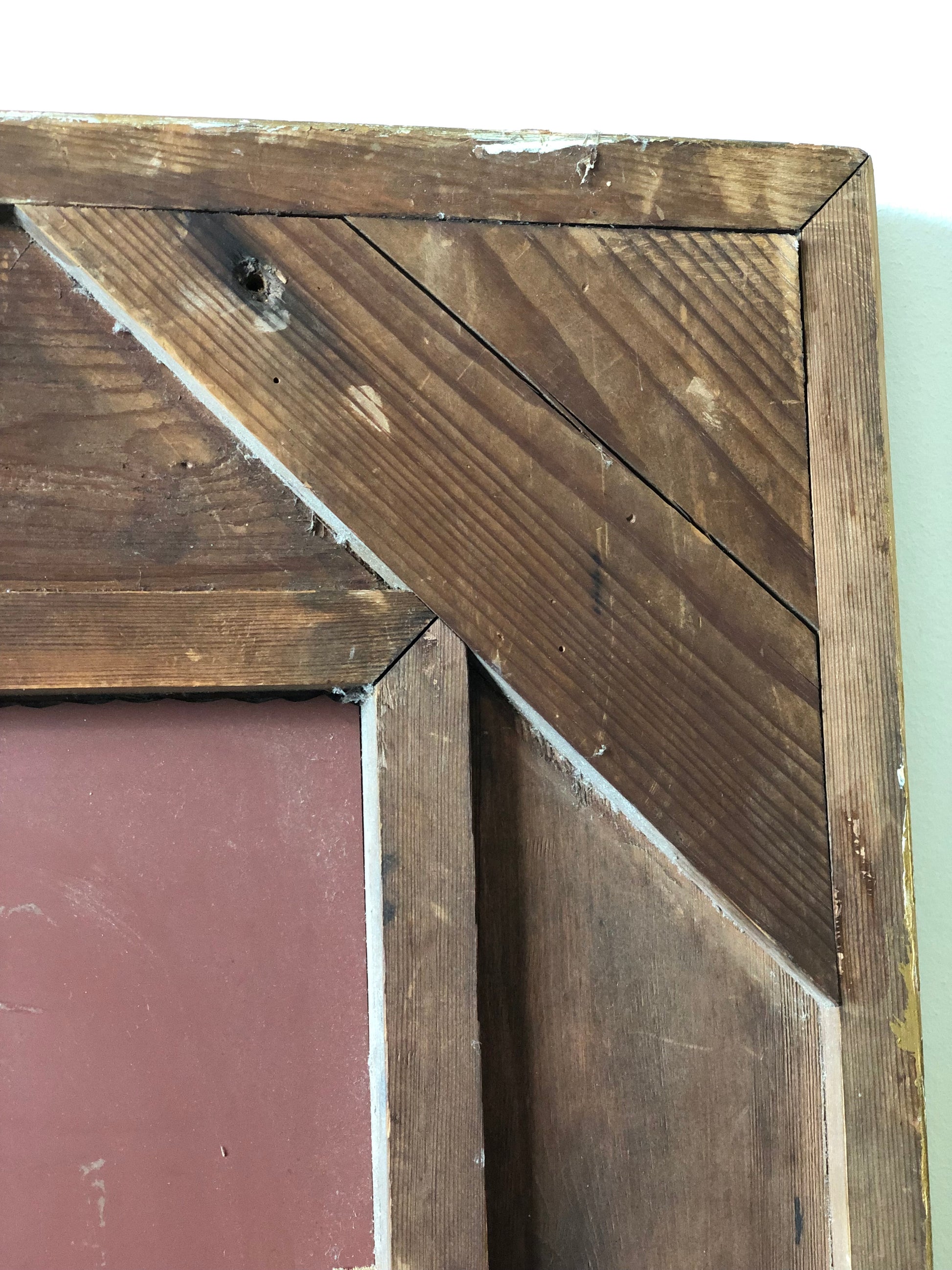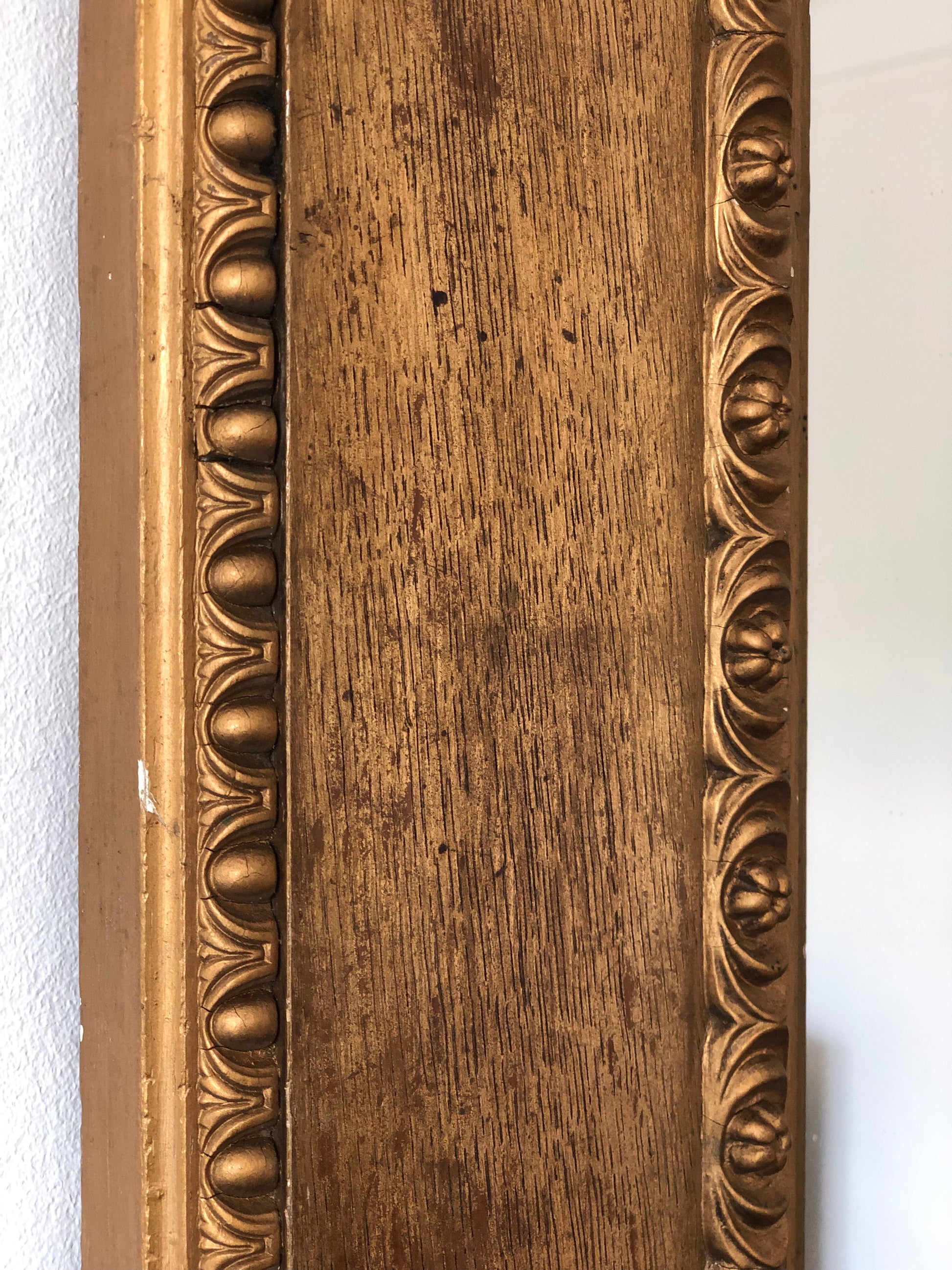 Condition: Good condition with light wear consistent with age. Three of the four corner rosettes are missing; the glass was replaced at a later date. Ready to hang.