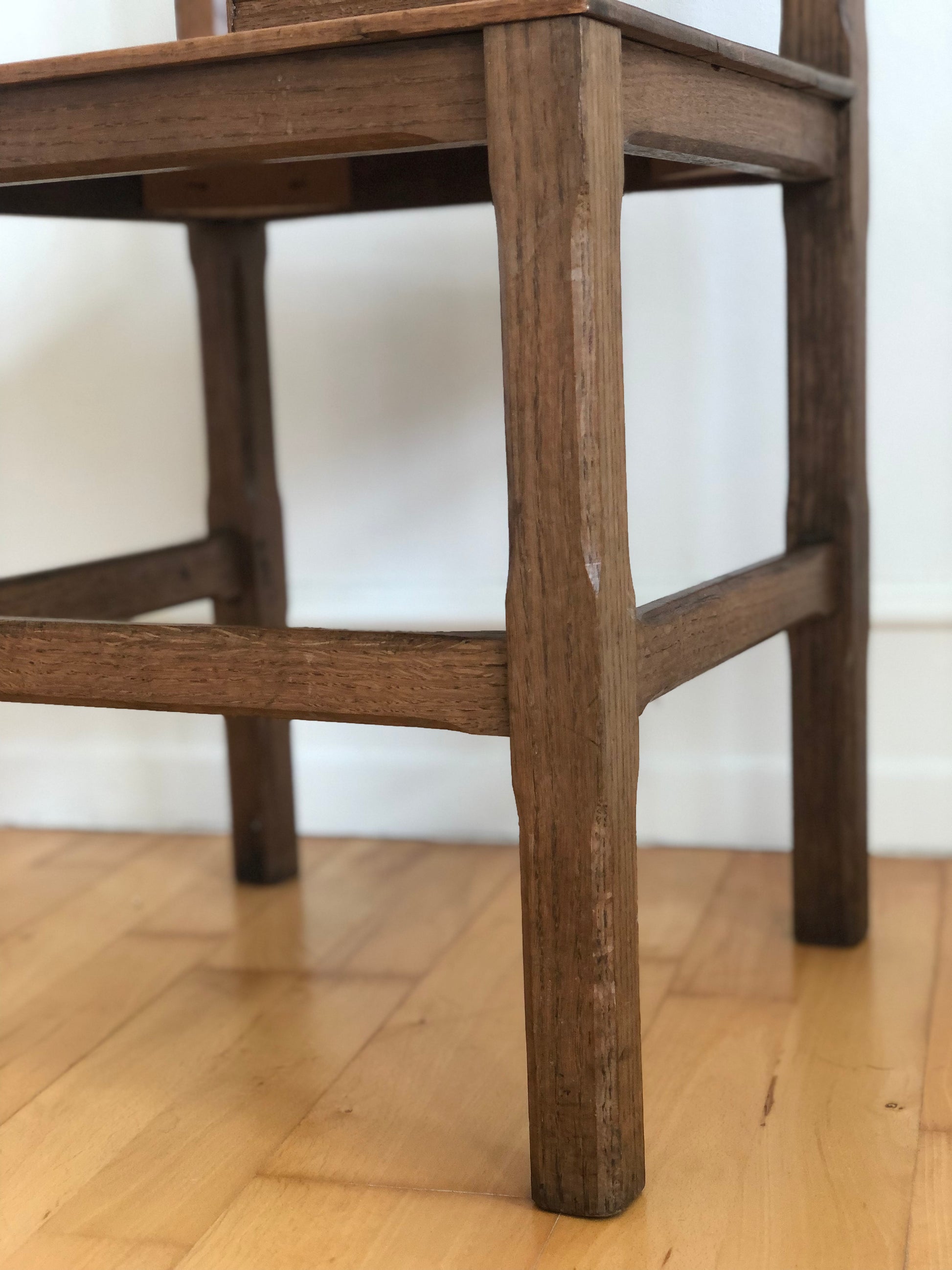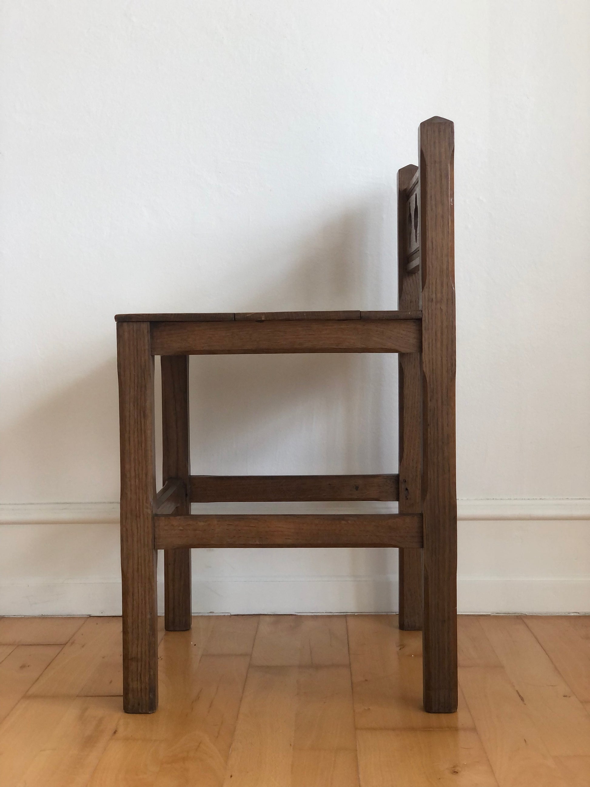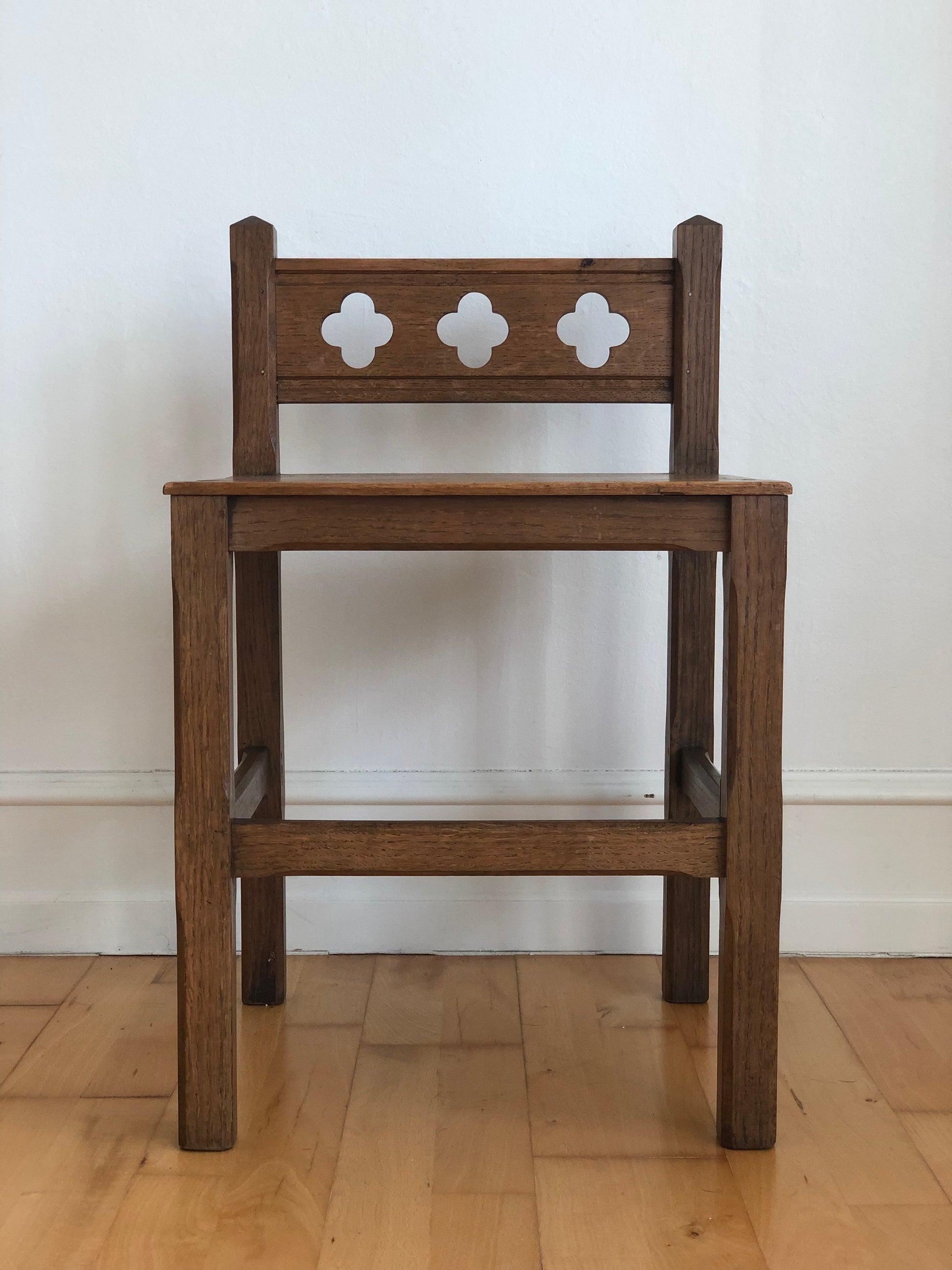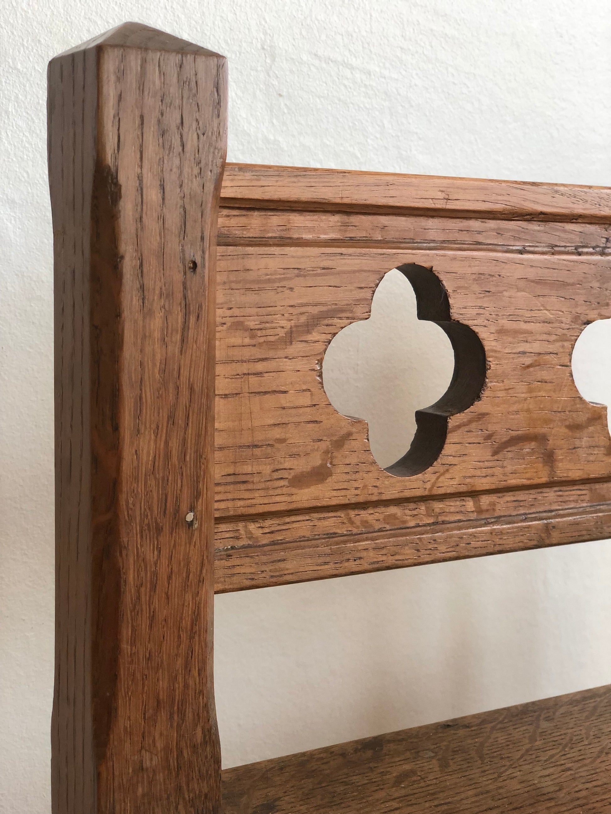 The chairs are made of solid oak and constructed using traditional mortise-and-tenon joinery, reinforced with additional corner braces beneath the seat. The backrests feature three clover-shaped cutouts. A subtle nod to the Neo-Gothic influences that were popular in Western Europe around 1920–1940.