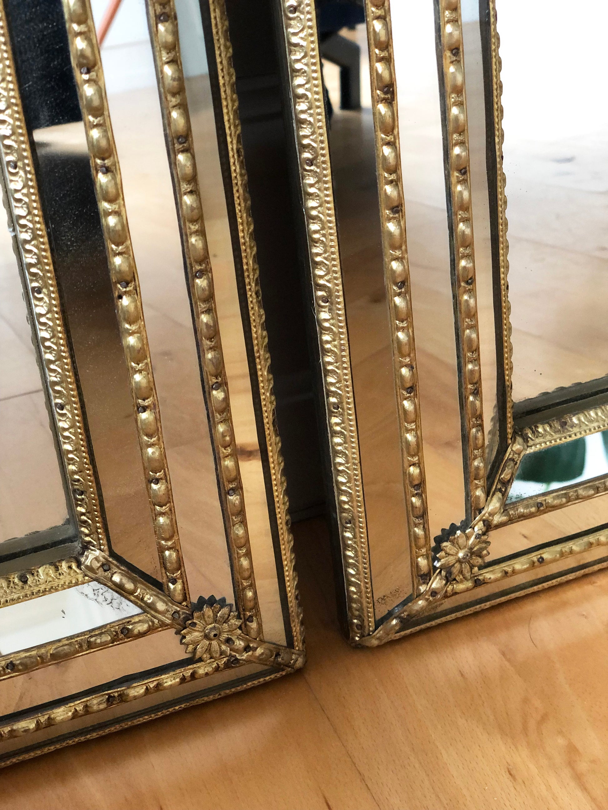 Condition: Good. Wear consistent with age, with light signs of use. One of the mirrors has small spots in the glass in the upper-left corner of the frame, see picture. Ready to hang.
