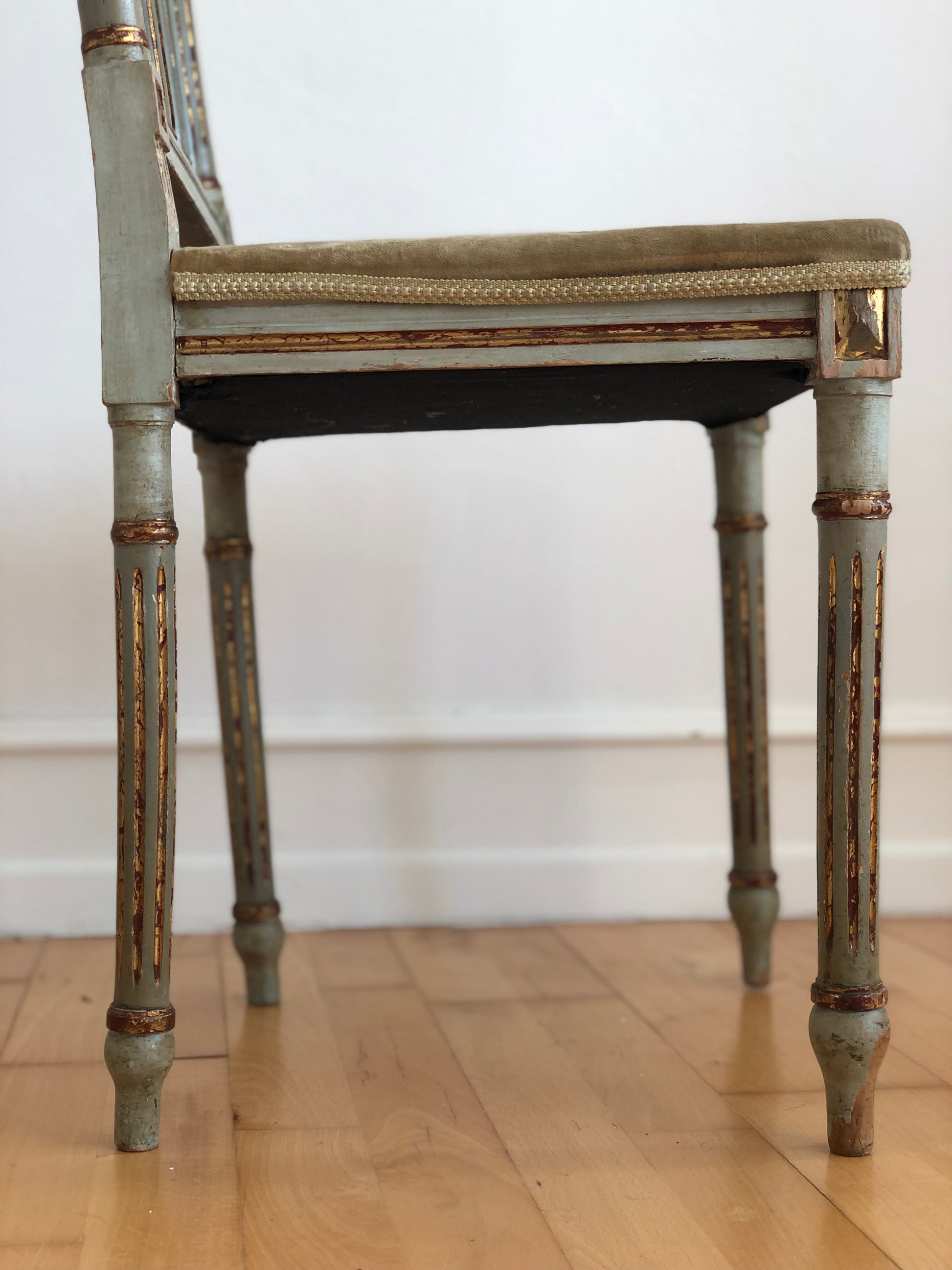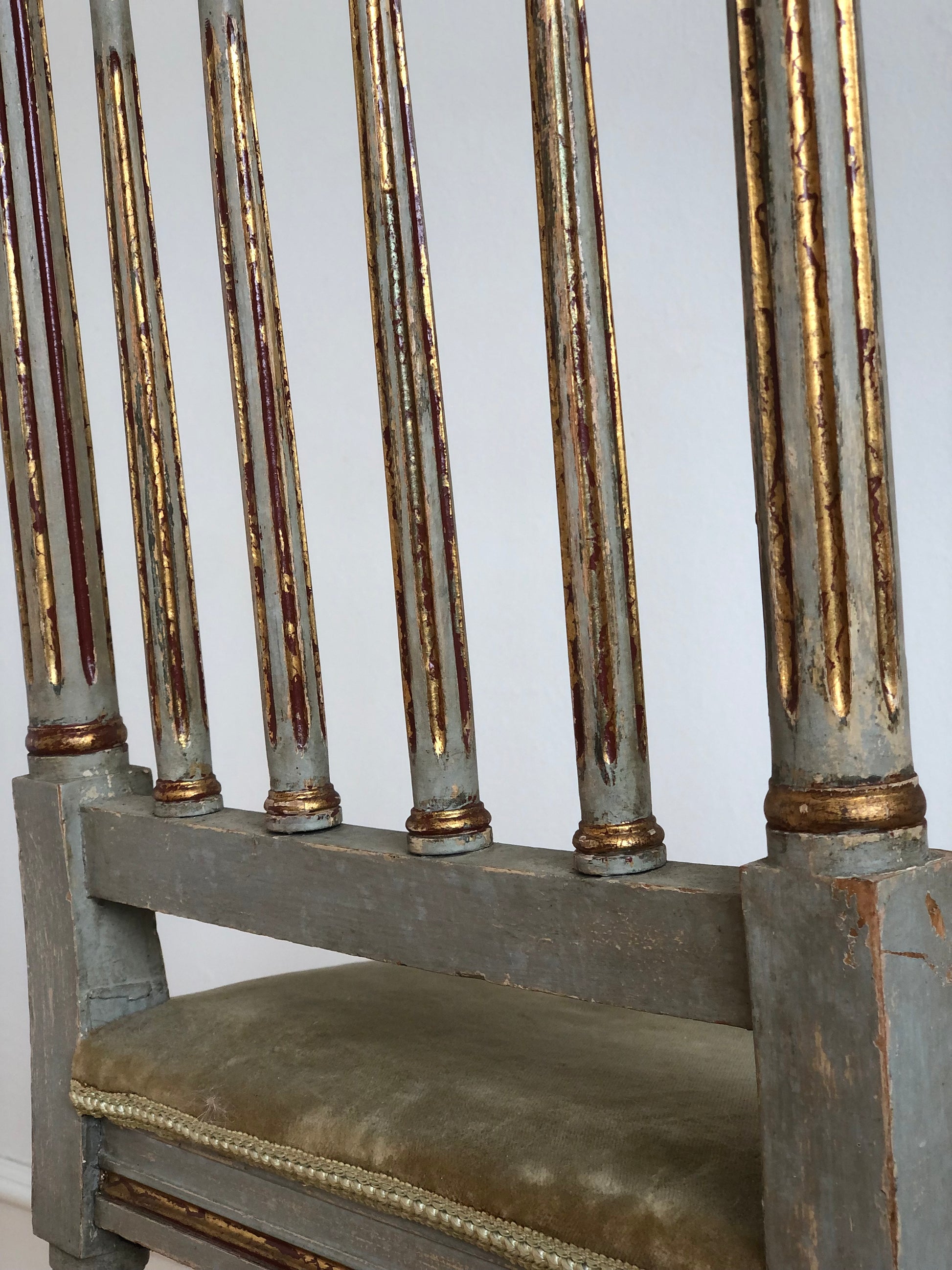 Colour: Grey painted frame, gilded details, green upholstery